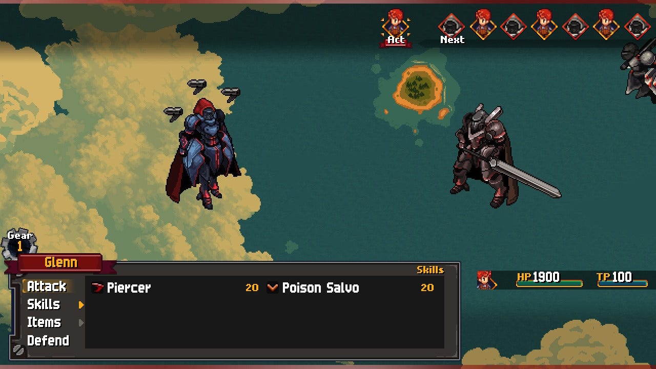 The story is great and all, but you might be saying, “This is a game, I can’t PLAY a story, how is the gameplay?” And to you I would say, first of all, relax, and second of all, the gameplay is magnificent. As I said at the top, Chained Echoes takes decades of learning from past RPGs and packs it into one game. First off, there’s no grinding; it’s basically impossible to grind. You make your characters strong by upgrading their weapons and equipment and unlocking and leveling up their special abilities. You can level up special abilities with what is equivalent to experience points, but the catch is that you get a minuscule amount from beating enemies. Most upgrade points will come from unlocking bonuses via world exploration and completing side quests. This mechanic was ingenious. It’s an easy way to reward for experiencing the content in the game. Sure, every piece of side content doesn’t result in a legendary weapon, but no matter what you do, there is almost always some sort of bonus that you’re working towards.