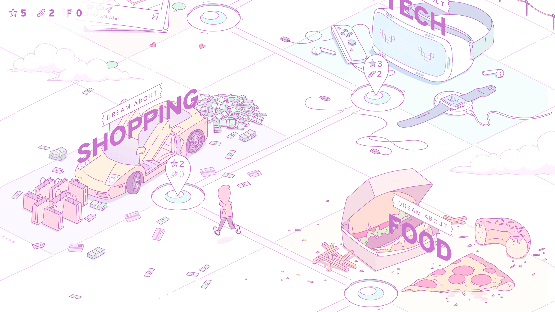 The music is aided by scenes of several life themes in dream-like settings. You’ll find yourself playing VR video games, shopping, exercising, working, and a handful of other things that will serve as visual fodder. Overall, I appreciated the art style. It used a softer color palette that you don’t often see in games, and nothing was overstimulating or hard to look at, which is appreciated when you need to lock your eyes on the screen for minutes at a time to track patterns.
